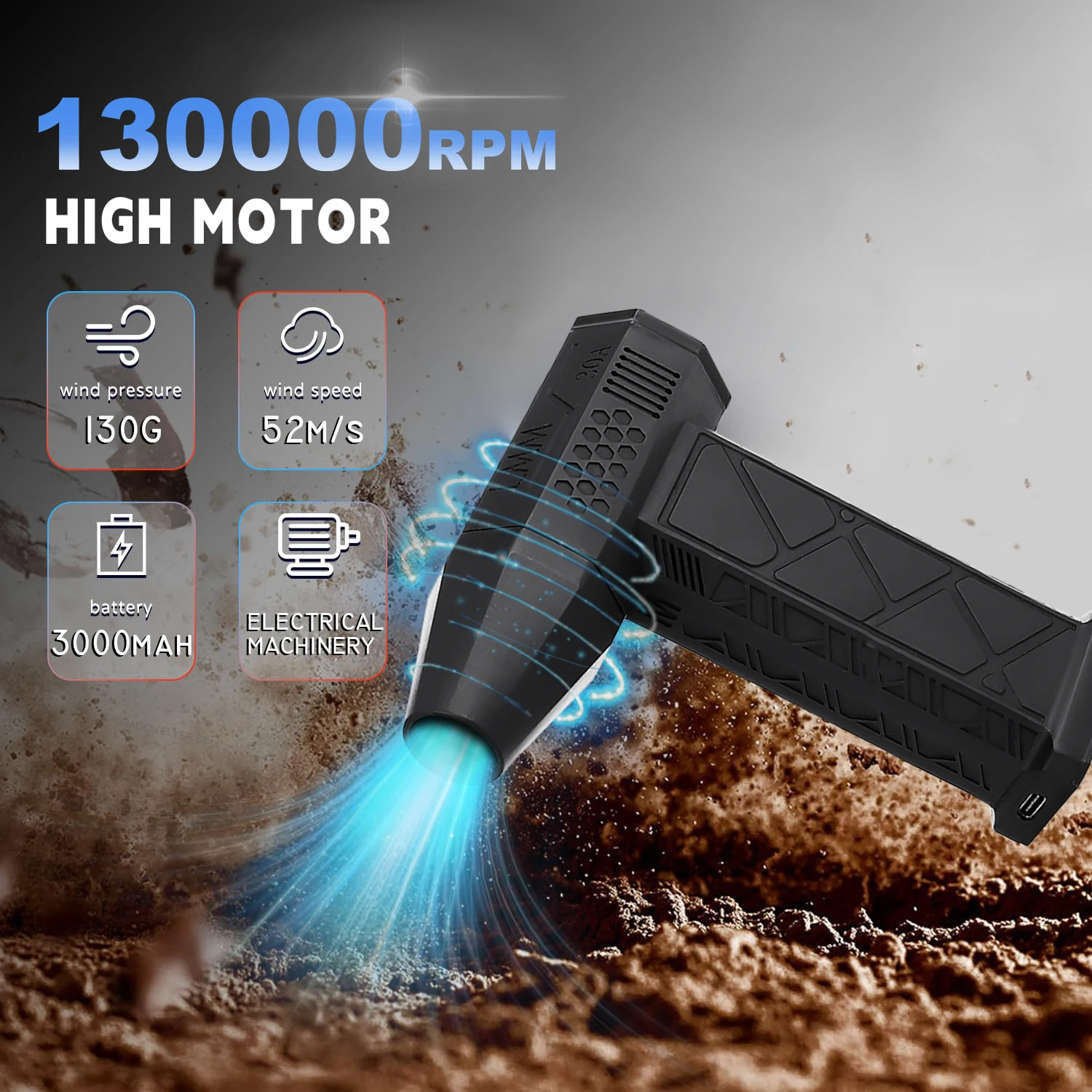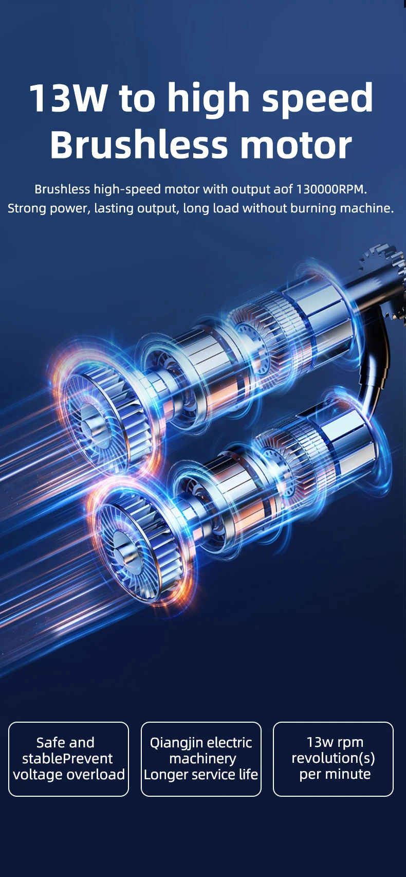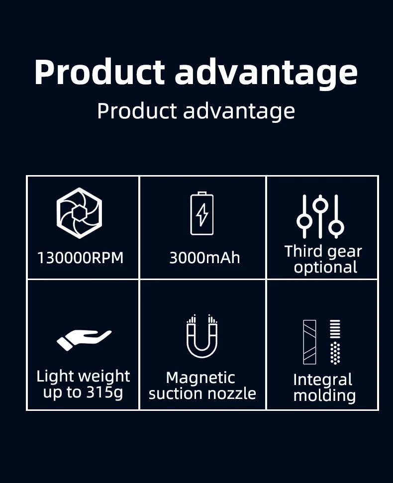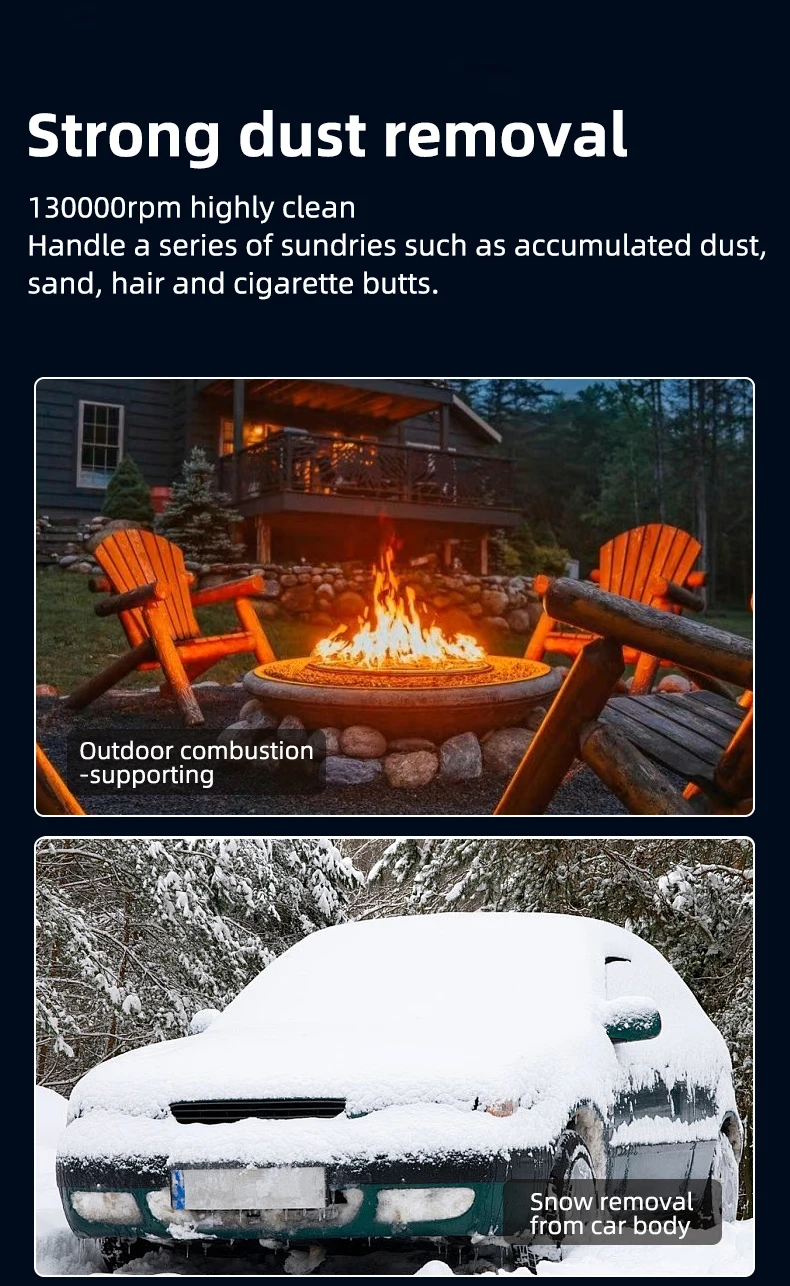 ?Mini soprador de jato?: Nosso Mini soprador de jato é compacto e leve, facilitando o transporte durante atividades ao ar livre.Com uma velocidade máxima de 130.000 RPM, nosso mini soprador oferece um fluxo de ar impressionante a uma velocidade máxima de 52 m/s.